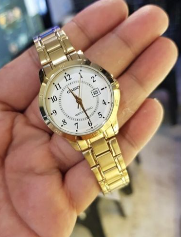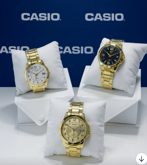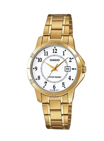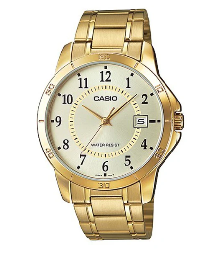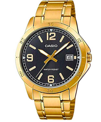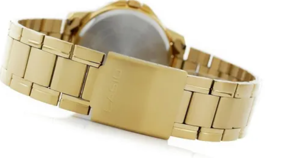 Alarm:no diameter:42 display type:analog dial color:black dial shape:round case material:steel case color:yellow brand:casio band material:steel band color:gold stopwatch:no mechanism:quartz calendar:yes glass material:mineral water resistance:3 atm