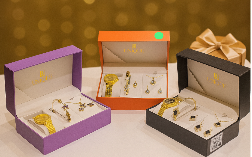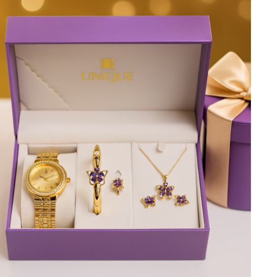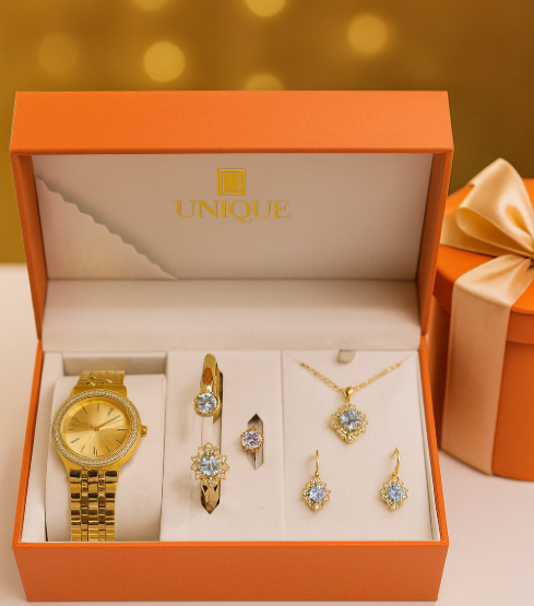 “UNIQUE” brand watch and matching jewelry gift set, featuring a sophisticated black and gold color scheme.