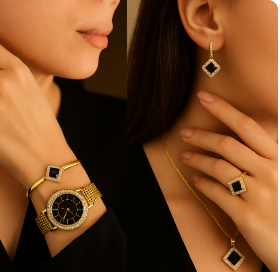 - A matching bracelet with black accents and gold-toned details.