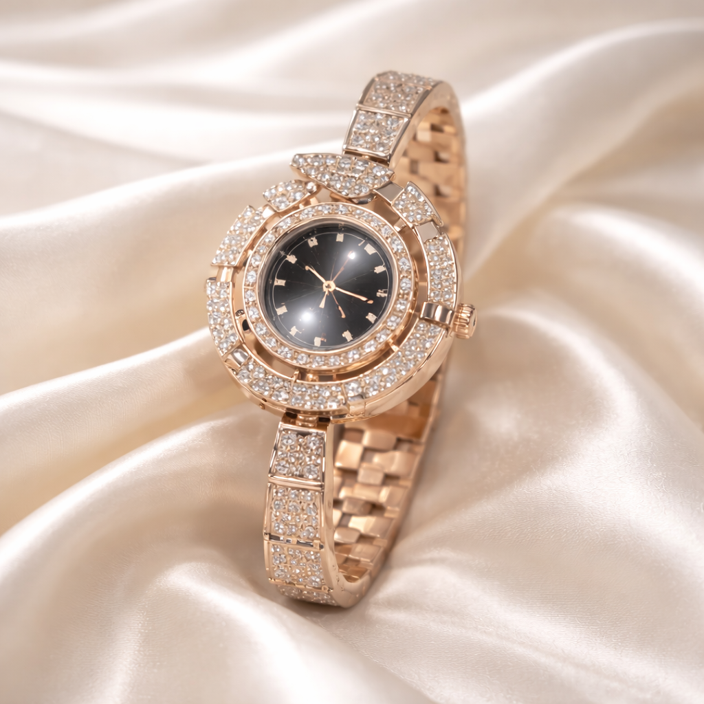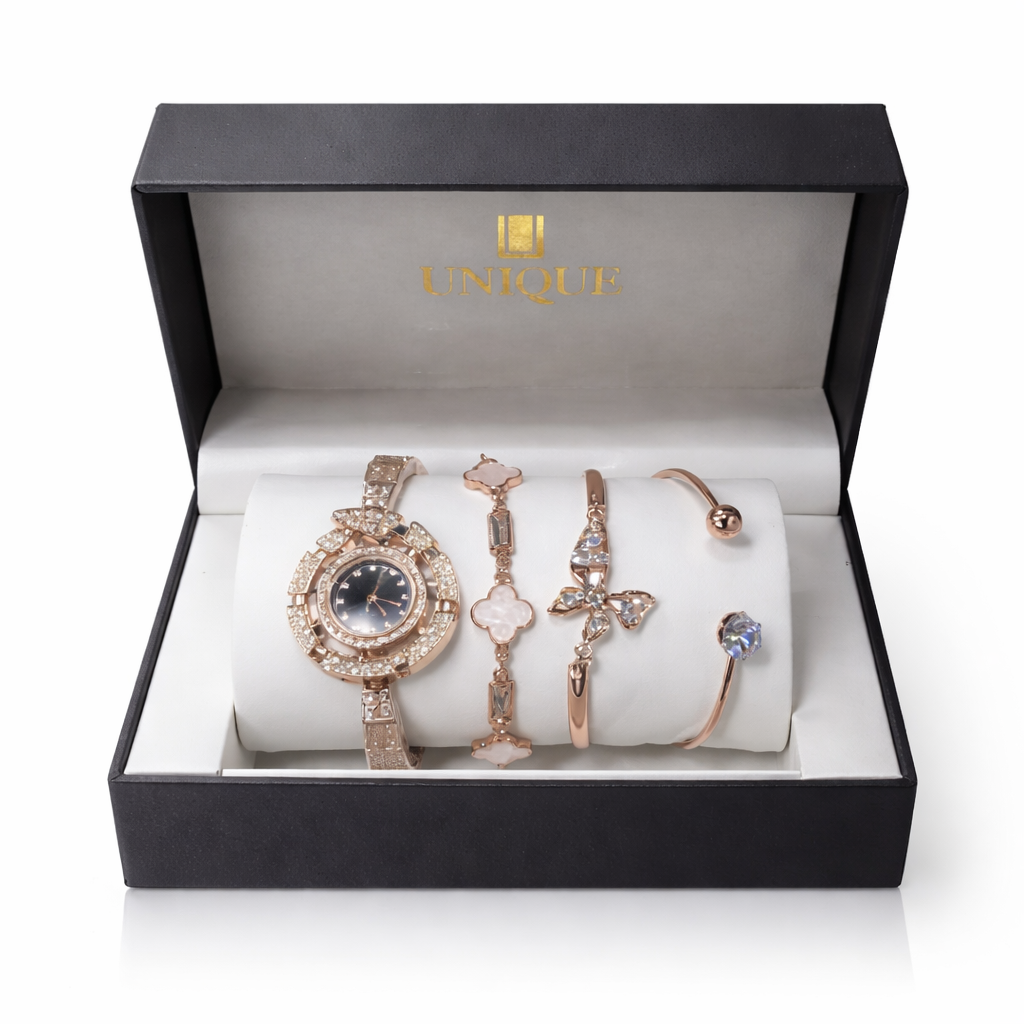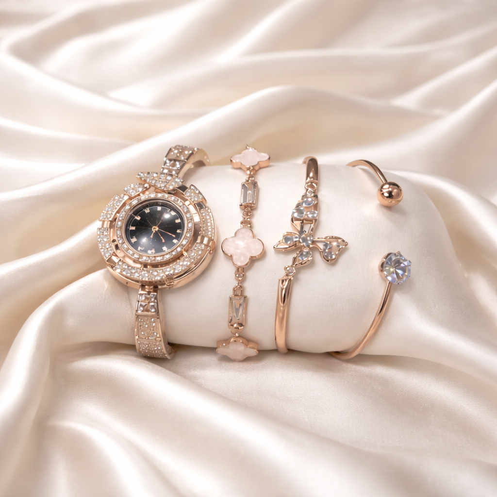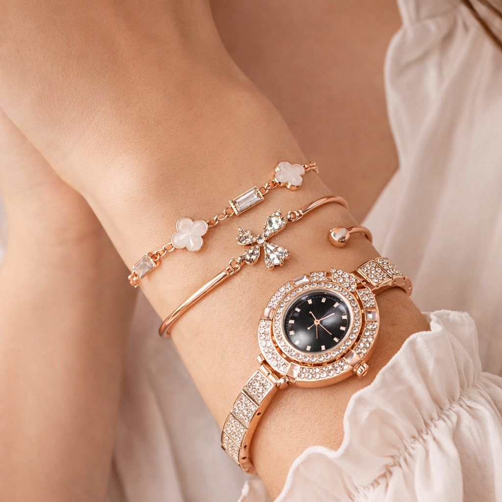 Rose Gold Watch & Bracelet Set for Women – Elegant Crystal Desig