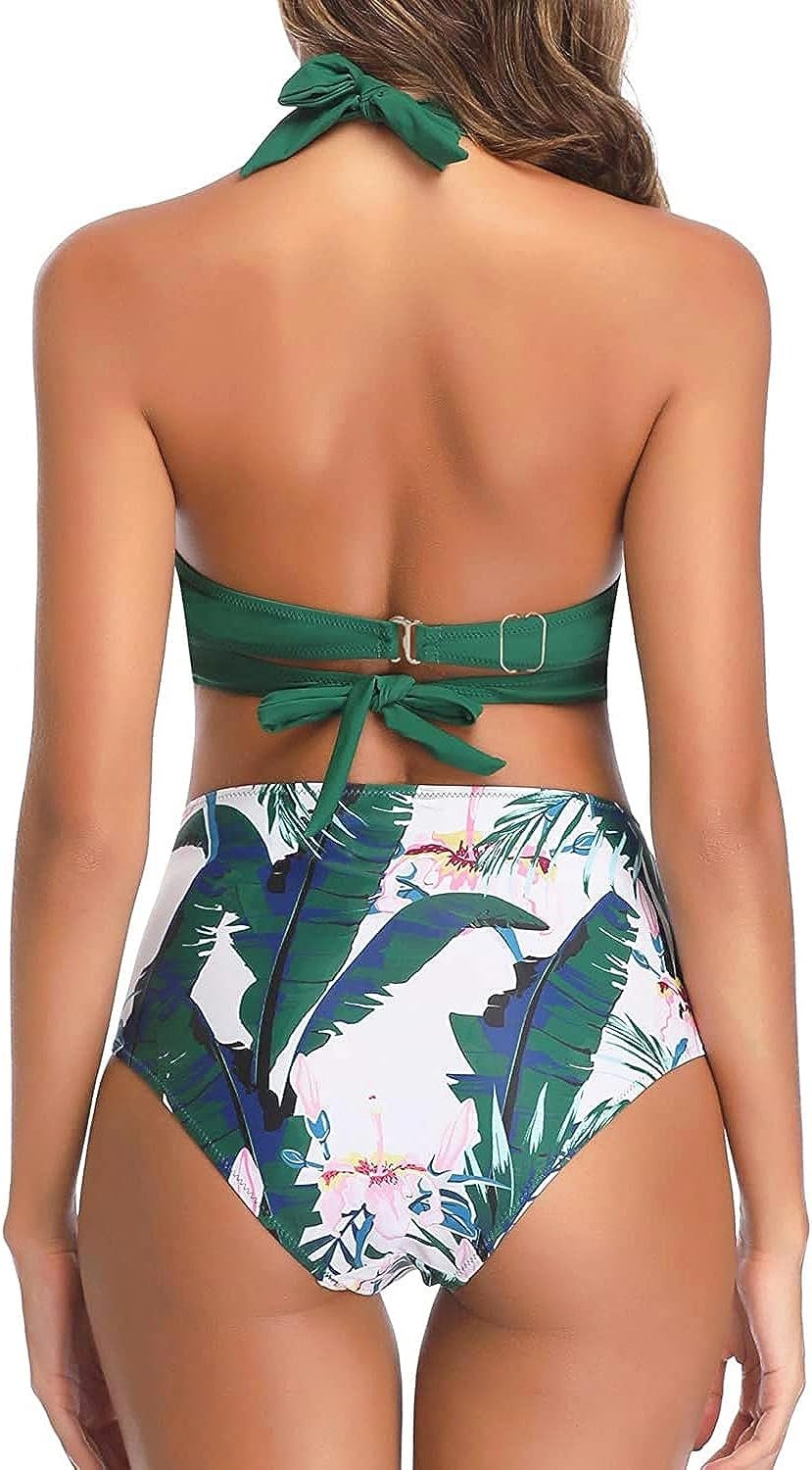 Tempt Me Women Two Piece Vintage Swimsuit Retro Halter Ruched High Waist Bikini with Bottom