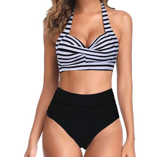 - Black retro top with high waist bottoms bathing suits makes you look amazing during a beach vacation, swimming pool, or honeymooning in Hawaii, etc.