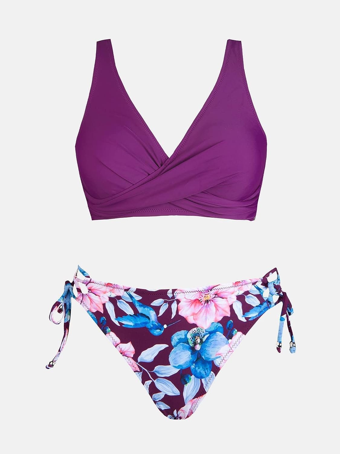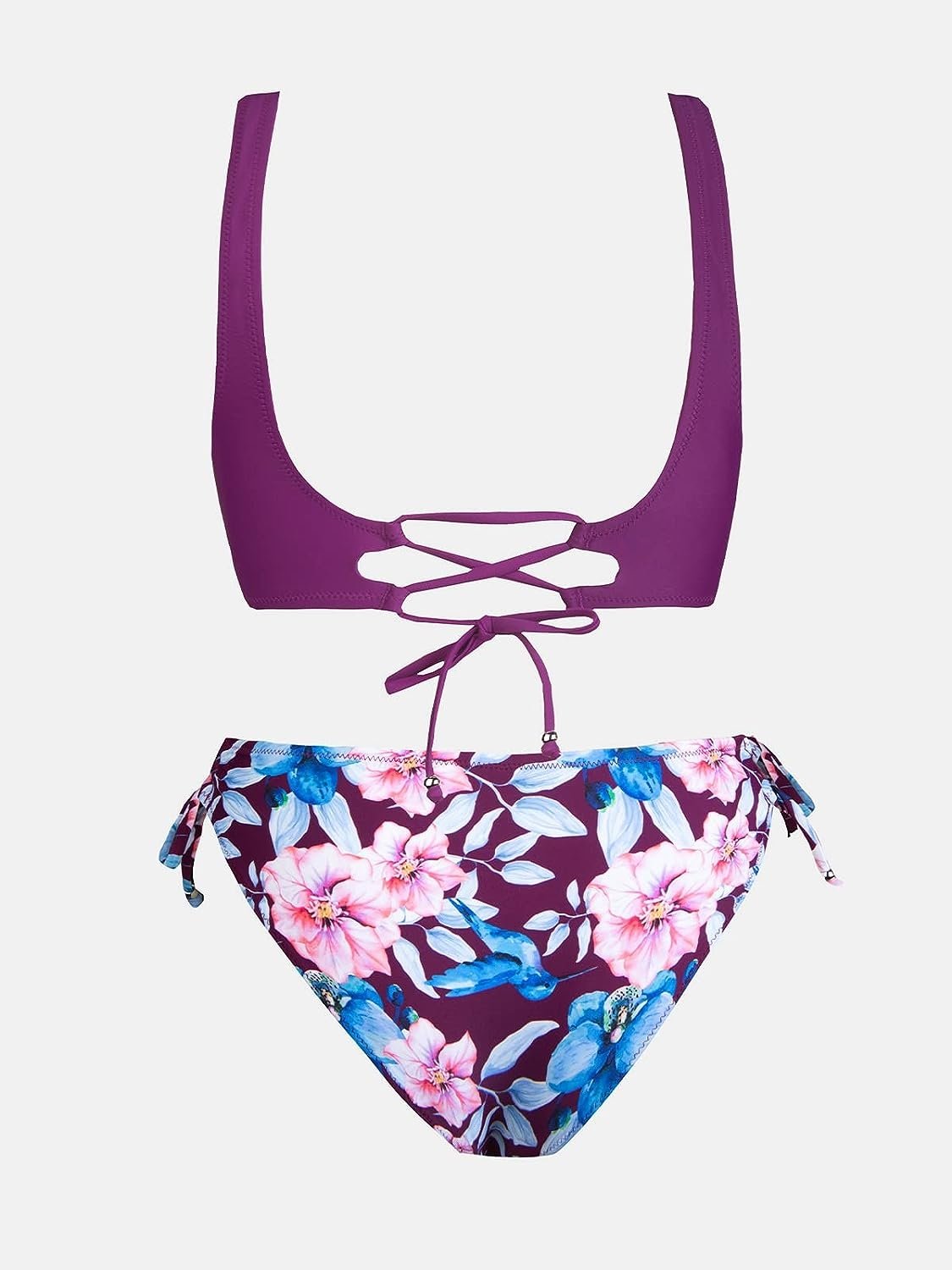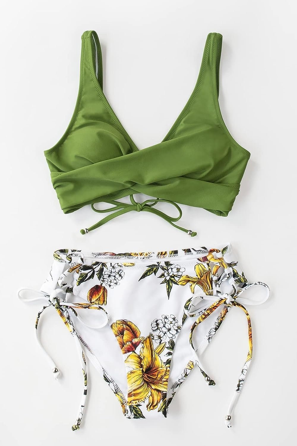 - Design: Tank and Wrapped Bikini Top with Lace-Up at Back. High Waisted and Floral Printed Bikini Bottom. About Cup Style: with Removable Pads