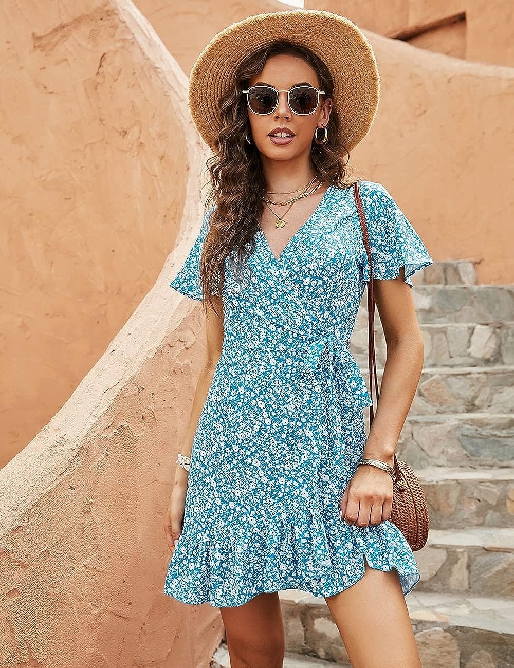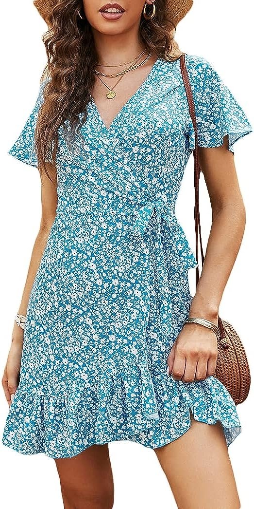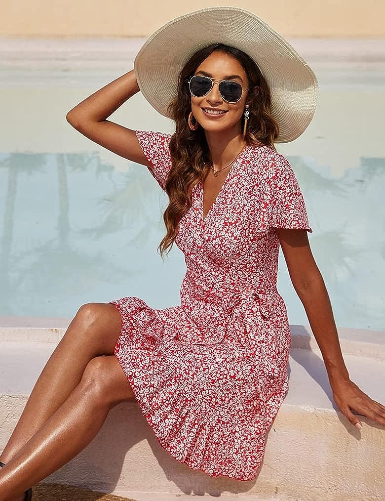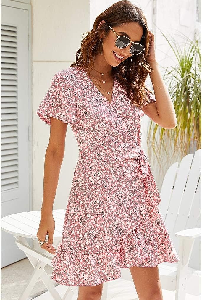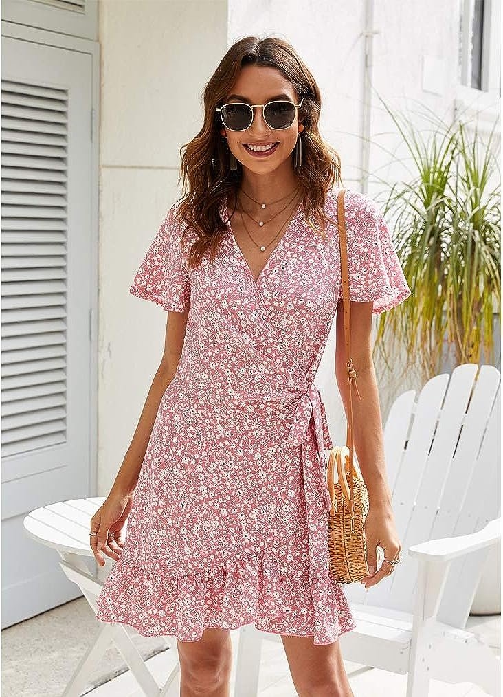 Wrap v neck,polka dot print,a line,short sleeve,above knee,tie waist,floral printed dress.