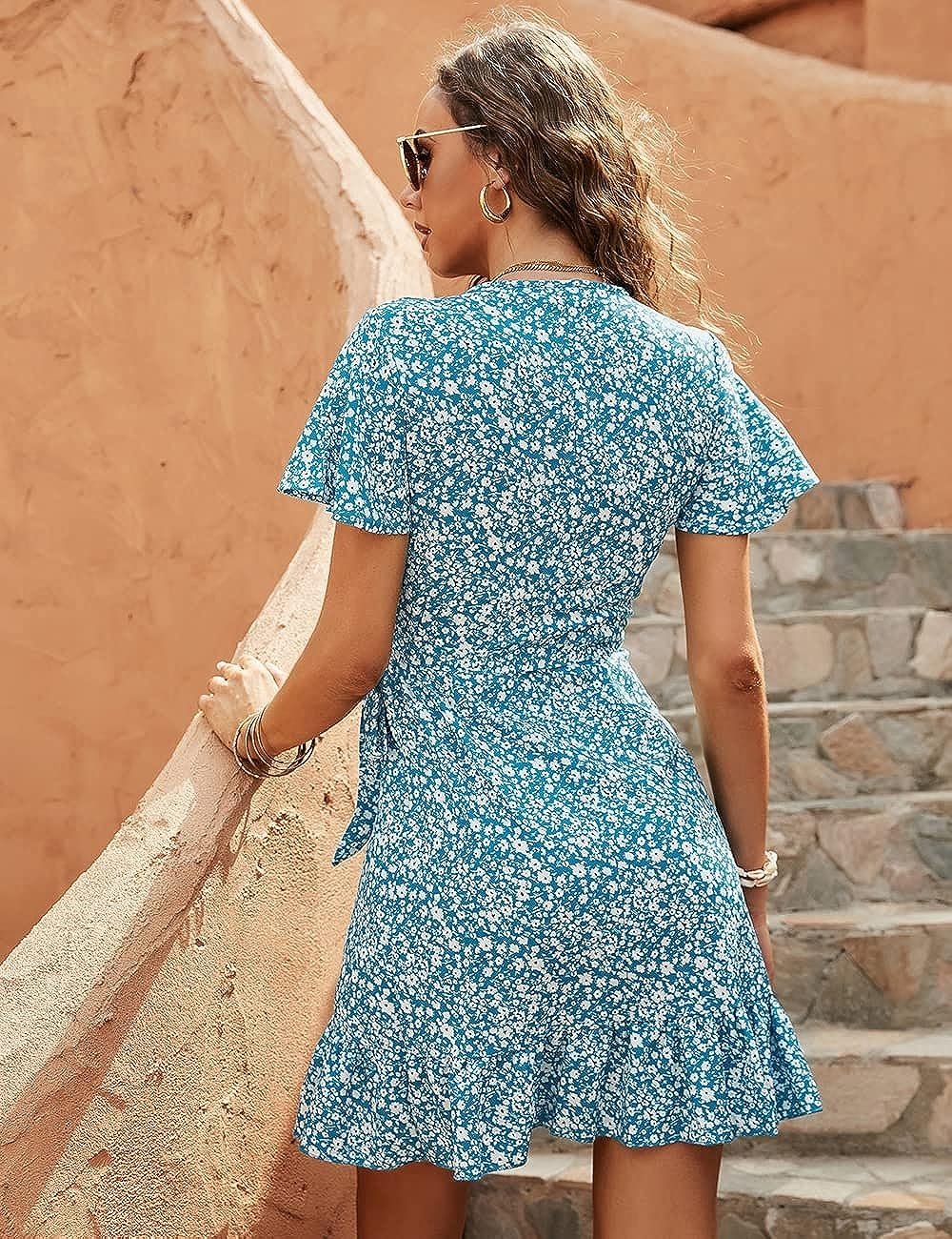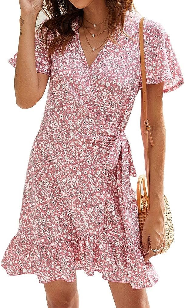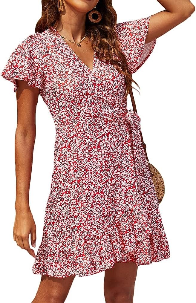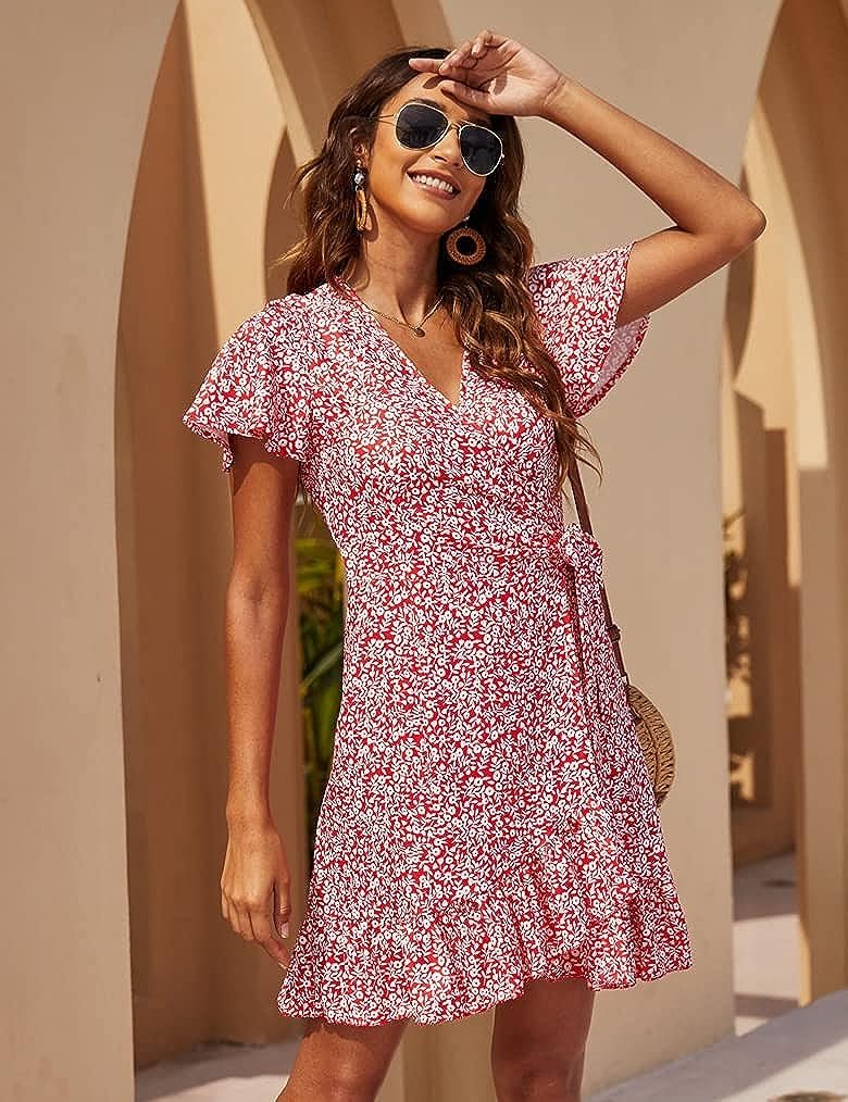 Women’s Wrap Dress Polka Dot Print Ruffle Short Sleeve Mini Dress with Belt