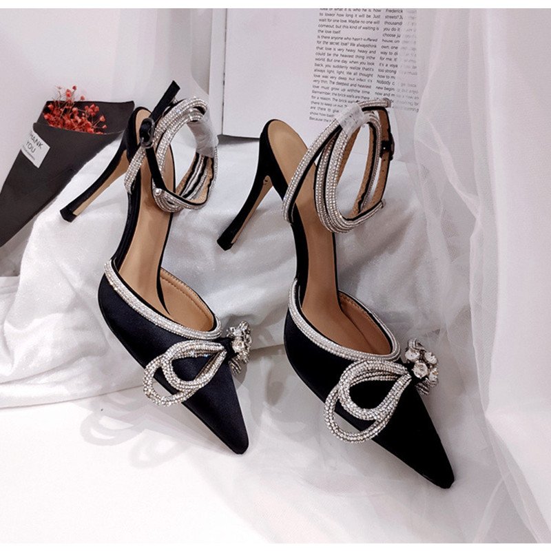 Runway style Glitter Rhinestones Women Pumps Crystal bowknot Satin Summer Lady Shoes Genuine leather High heels Party Prom Shoes