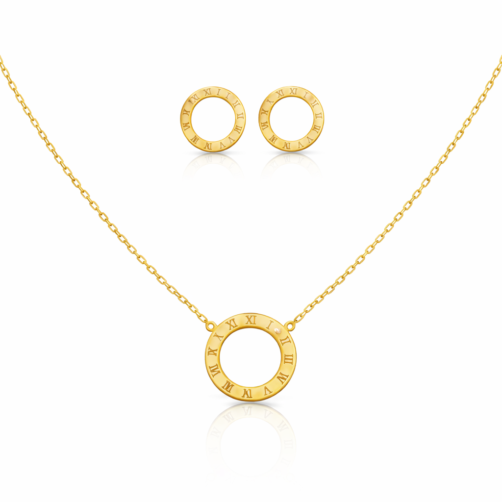 Add timeless elegance to your collection with this 10K gold plated Roman numeral jewelry set, featuring a sleek circular pendant and matching stud earrings. The minimalist open-circle design engraved with Roman numerals offers a modern yet classic look, perfect for everyday wear or special occasions.