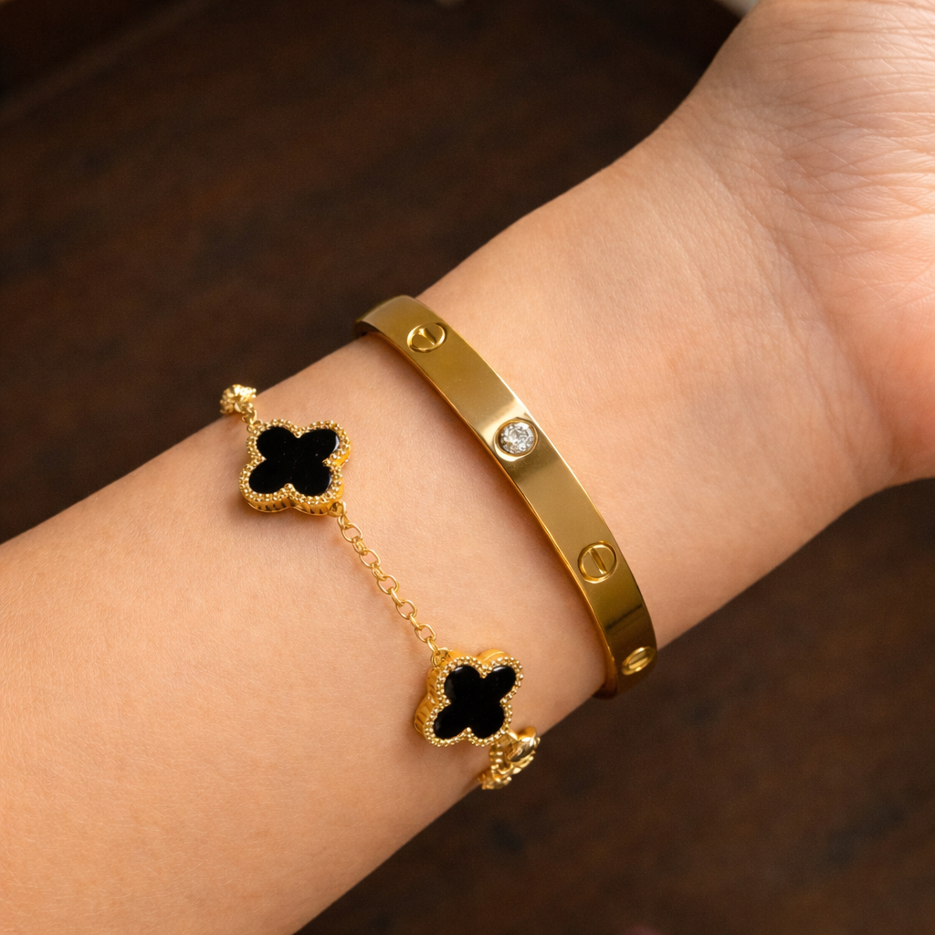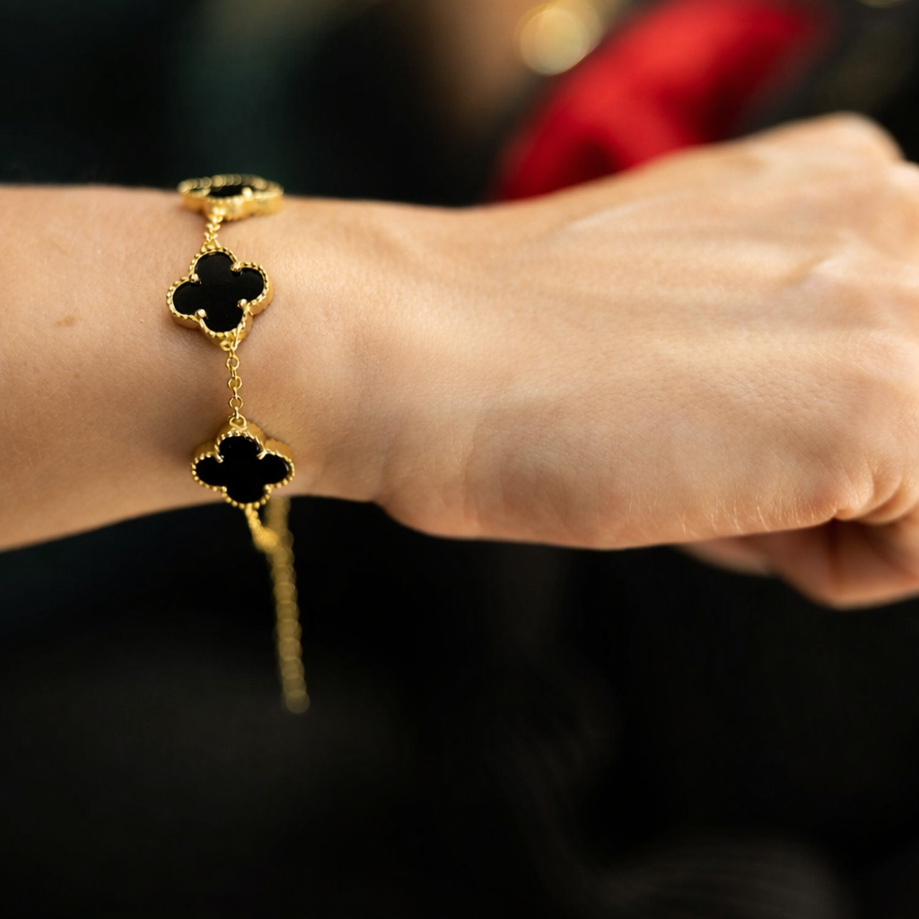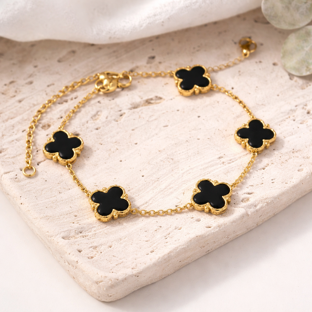 Add a touch of luxury and sophistication to your everyday style with this beautifully crafted 10K gold plated black clover bracelet. Featuring sleek black enamel clover charms framed in a radiant gold finish, this bracelet offers a timeless, elegant look that complements both casual and formal outfits.